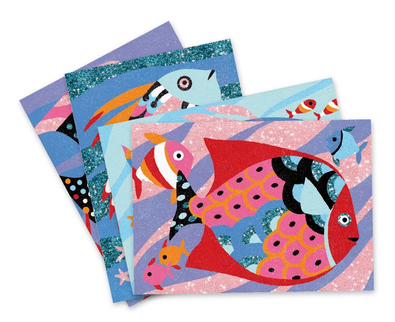 La mecánica de este juego es tan ingeniosa como atractiva. Cada set incluye cuatro tarjetas adhesivas pre-ilustradas con encantadores diseños de peces. Con una herramienta especial, los niños descubrirán las zonas adhesivas, una a una, para luego espolvorear las nueve arenas de colores vibrantes y los dos tubos de purpurina incluidos, siguiendo un código de colores intuitivo. El diseño inteligente de la caja permite trabajar de forma limpia, recogiendo el exceso de arena para reutilizarlo, haciendo de esta una actividad libre de preocupaciones y llena de diversión.