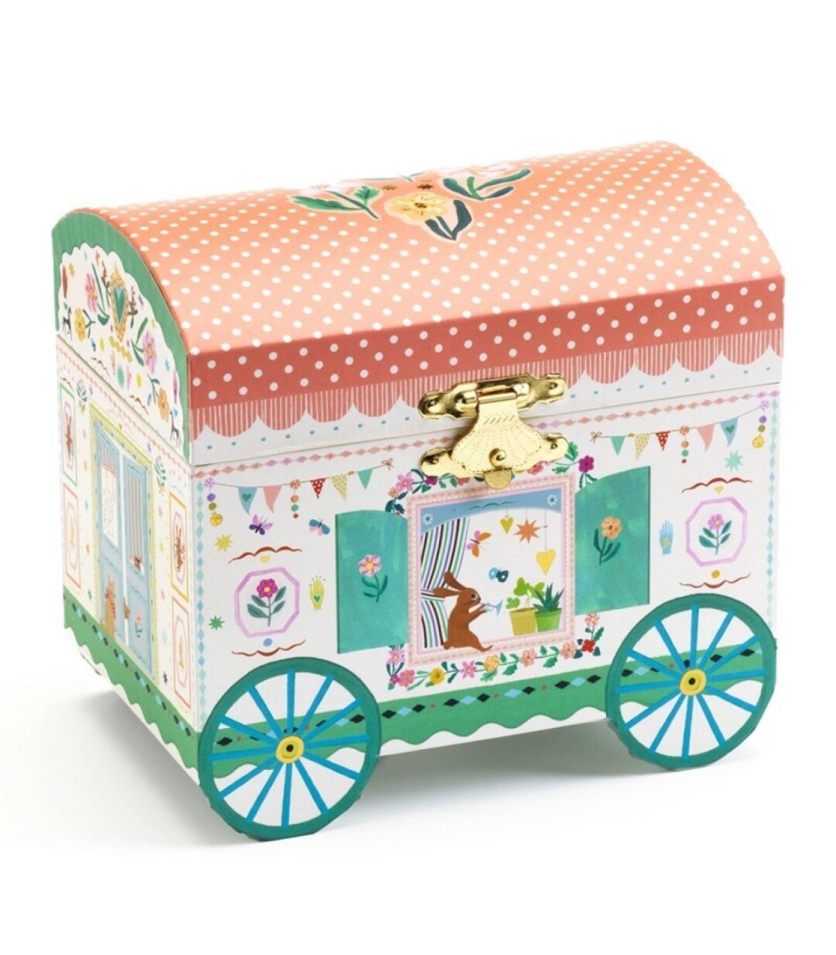 Adéntrate en un mundo de fantasía con la Caja de Música Caravana Encantadora de Djeco, un tesoro que combina la magia de una melodía con la funcionalidad de un joyero. Esta preciosa caravana, bellamente ilustrada con detalles artísticos y colores suaves, está diseñada para cautivar la imaginación de los más pequeños y convertirse en un elemento decorativo único en su habitación. Es el regalo perfecto para inspirar sueños y guardar secretos.