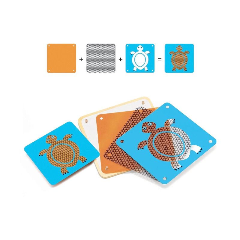 La mecánica de Animologix es ingeniosamente sencilla pero profundamente enriquecedora. Utilizando un robusto tablero de madera, los niños eligen entre diferentes tarjetas transparentes: una de animal, una de pelaje y una de color. El desafío consiste en superponerlas en el orden correcto para replicar los 30 modelos propuestos o, aún mejor, para inventar sus propios animales disparatados. Este proceso manipulativo ayuda a comprender la composición de las imágenes y la secuenciación, introduciendo de forma natural el concepto de profundidad y la relación espacial de los objetos.