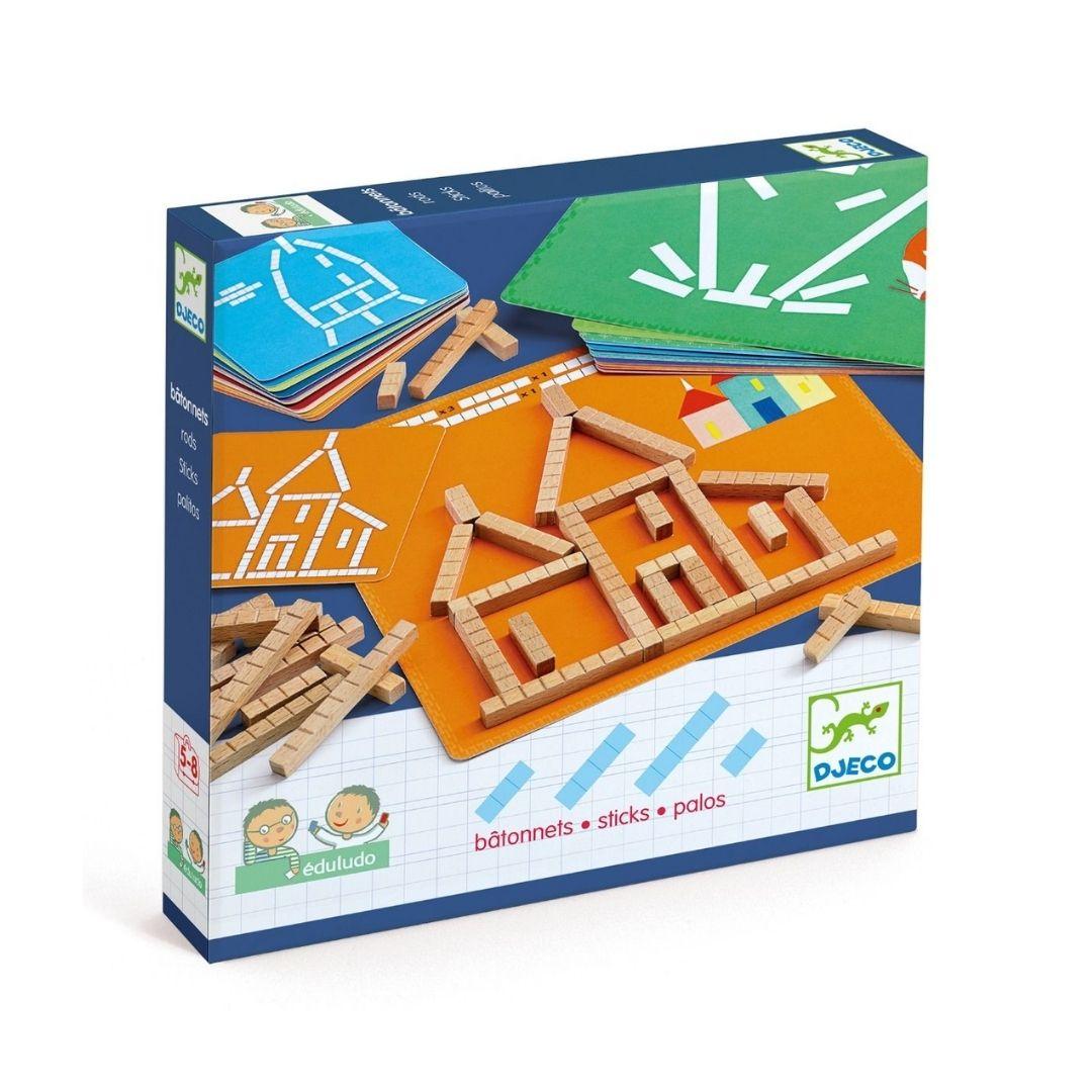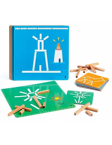 La mecánica de Djeco Eduludo Palos es sencilla y progresiva. El juego incluye 12 plantillas de juego con diferentes diseños y niveles de dificultad, y 48 palitos de madera de variadas longitudes. El desafío consiste en recrear los patrones de las plantillas utilizando los palitos adecuados, prestando atención a cada detalle. Los pequeños jugadores pueden autoevaluar su progreso con las 12 tarjetas de soluciones incluidas, lo que fomenta la autonomía y la capacidad de corrección. Desde figuras simples hasta construcciones más complejas, cada plantilla es un nuevo enigma a resolver.