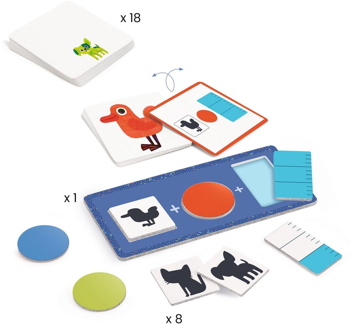- Contenido: 1 tablero base, láminas transparentes con patrones, 24 cartas de reto y tarjetas de animales.