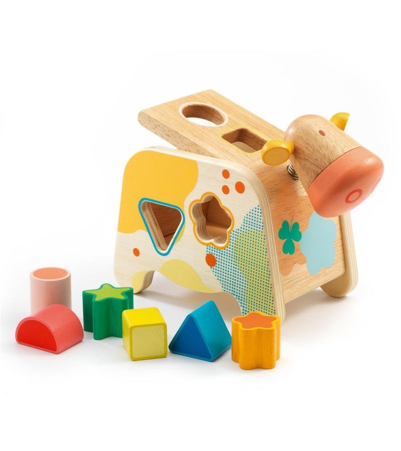 - Contenido: 1 caja con forma de vaca (madera y metal) y 6 formas geométricas de madera.