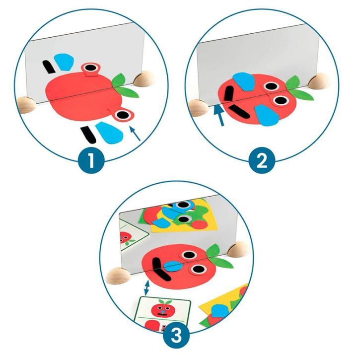 La mecánica de Djeco Ze Mirror Faces es tan sencilla como sorprendente: los niños eligen una de las 20 tarjetas de modelo y colocan las formas de papel bajo el espejo, deslizándolas y superponiéndolas hasta recrear la cara deseada. Pero la diversión no termina ahí; también pueden experimentar libremente, creando sus propios personajes y expresiones. El set incluye un espejo (plástico), 50 formas de papel vibrantes (2 copias de cada uno de los 25 diseños) y las 20 tarjetas de ejemplo. Cada interacción es un nuevo descubrimiento, fomentando la observación y la coordinación óculo-manual de forma espontánea.