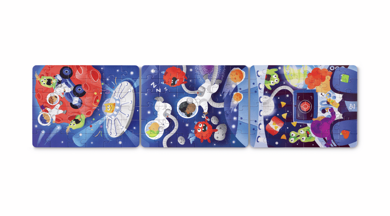 El Hape Puzle Aventura Espacial  es un set de puzles “con historia” para peques curiosos que sueñan con cohetes, planetas y viajes intergalácticos. Incluye 3 puzles que se pueden montar por separado y unir para crear una gran escena espacial, además de 12 fichas de cuento para inventar aventuras diferentes cada vez. También trae un póster guía que encaja en la tapa de la caja y ayuda a montar con más autonomía. Ideal para jugar en familia, conversar y descubrir detalles: cada pieza es un pequeño paso hacia las estrellas.