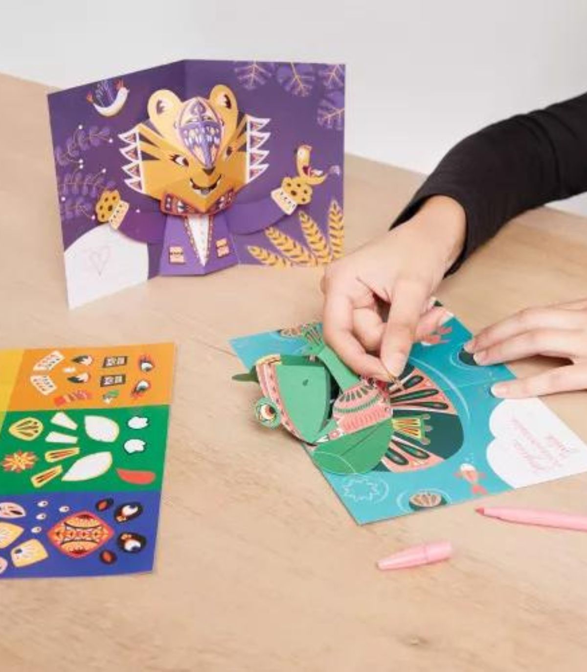 Cada caja contiene todo lo necesario para dar vida a seis tarjetas pop-up diferentes, cada una con un adorable animal protagonista. Los niños encontrarán elementos pre-cortados de cartón resistente, fáciles de doblar y pegar, siguiendo unas sencillas instrucciones ilustradas paso a paso. La mecánica es intuitiva: unir las piezas correctamente y doblar en los puntos indicados para que, al abrir la tarjeta, el animal cobre vida con un efecto sorpresa. No se requiere experiencia previa, solo ganas de crear y divertirse.