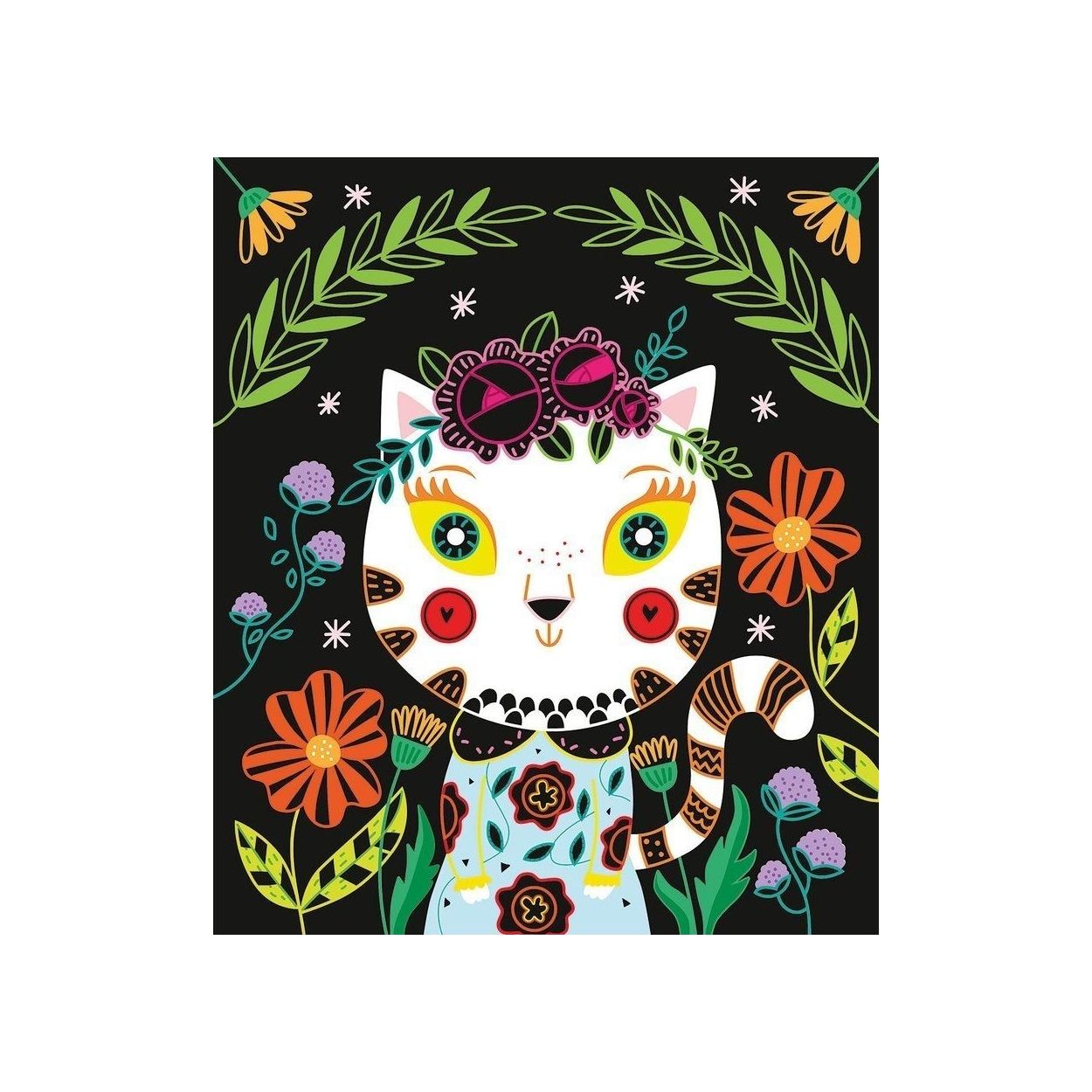 El kit incluye varias tarjetas con bonitas ilustraciones de gatos escondidas bajo una capa de tinta negra. El desafío y la diversión consisten en usar el lápiz especial incluido para rascar las zonas deseadas, dejando al descubierto los brillantes colores que se encuentran debajo. Puedes seguir los patrones preestablecidos para dar vida a los gatitos o dejar volar la imaginación y añadir tus propios detalles, creando así piezas únicas y personalizadas. Es una actividad sencilla pero profundamente gratificante, perfecta para un momento de concentración y calma.