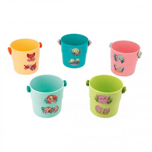 Los Janod Cubos Mis Animales Bebés son un set de 5 cubos apilables para el baño que convierten el agua en un pequeño laboratorio de juego. Cada cubo tiene agujeros diferentes en la base para que el agua salga de distintas formas, y también incluye números del 1 al 5 para sumar propuestas de juego mientras se bañan. Son fáciles de agarrar por manos pequeñas, flotan y se apilan, así que sirven tanto para explorar como para construir. Un juguete perfecto para acompañar rutinas con calma: “llenar, mirar caer, volver a empezar”.