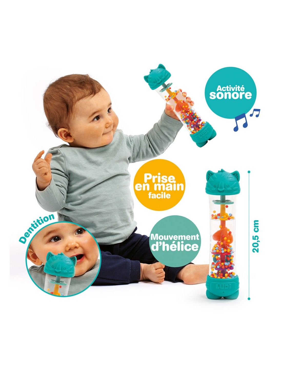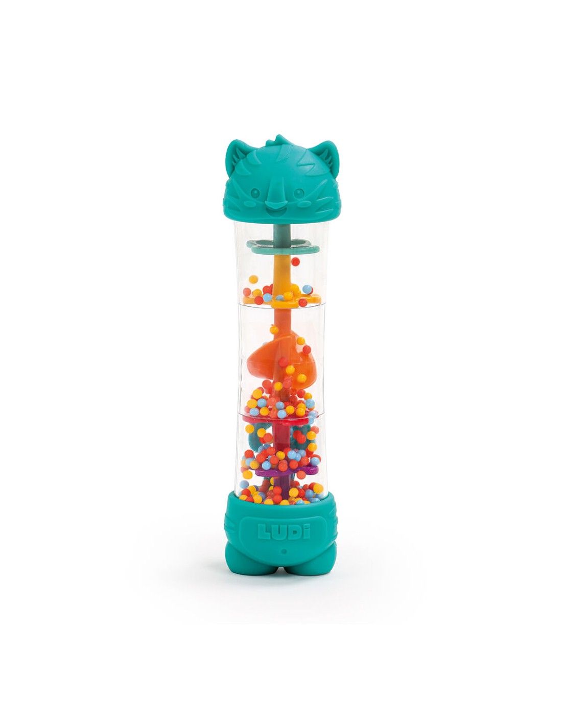La mecánica del Ludi Palo de lluvia es sencilla e intuitiva. Al inclinarlo, girarlo o agitarlo, las coloridas bolitas en su interior descienden por una espiral, chocando suavemente y produciendo un sonido idéntico al de la lluvia. Los pequeños extremos con forma de tigre no solo son adorables, sino que también incorporan áreas texturizadas pensadas para el alivio durante la dentición. Su tamaño y forma están perfectamente adaptados para que las pequeñas manos lo agarren con facilidad, fomentando la exploración independiente.