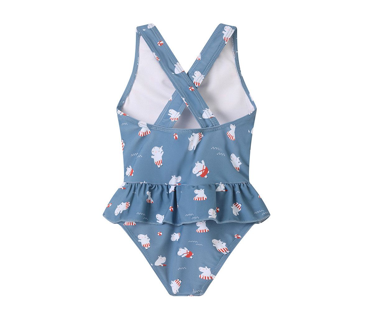 Este bañador destaca por su diseño inteligente y lleno de detalles. Su vibrante estampado de simpáticos hipopótamos sobre un fondo alegre invita a la imaginación, mientras que los delicados volantes añaden un toque de encanto a la silueta. El corte cruzado en la espalda no solo proporciona un ajuste seguro y cómodo, evitando deslizamientos inesperados, sino que también facilita que las niñas puedan vestirse y desvestirse con mayor autonomía. Confeccionado con tejidos suaves y resistentes que ofrecen protección solar UPF 50+, garantiza durabilidad y una sensación agradable sobre la piel, ideal para horas de juego en la piscina o la playa.