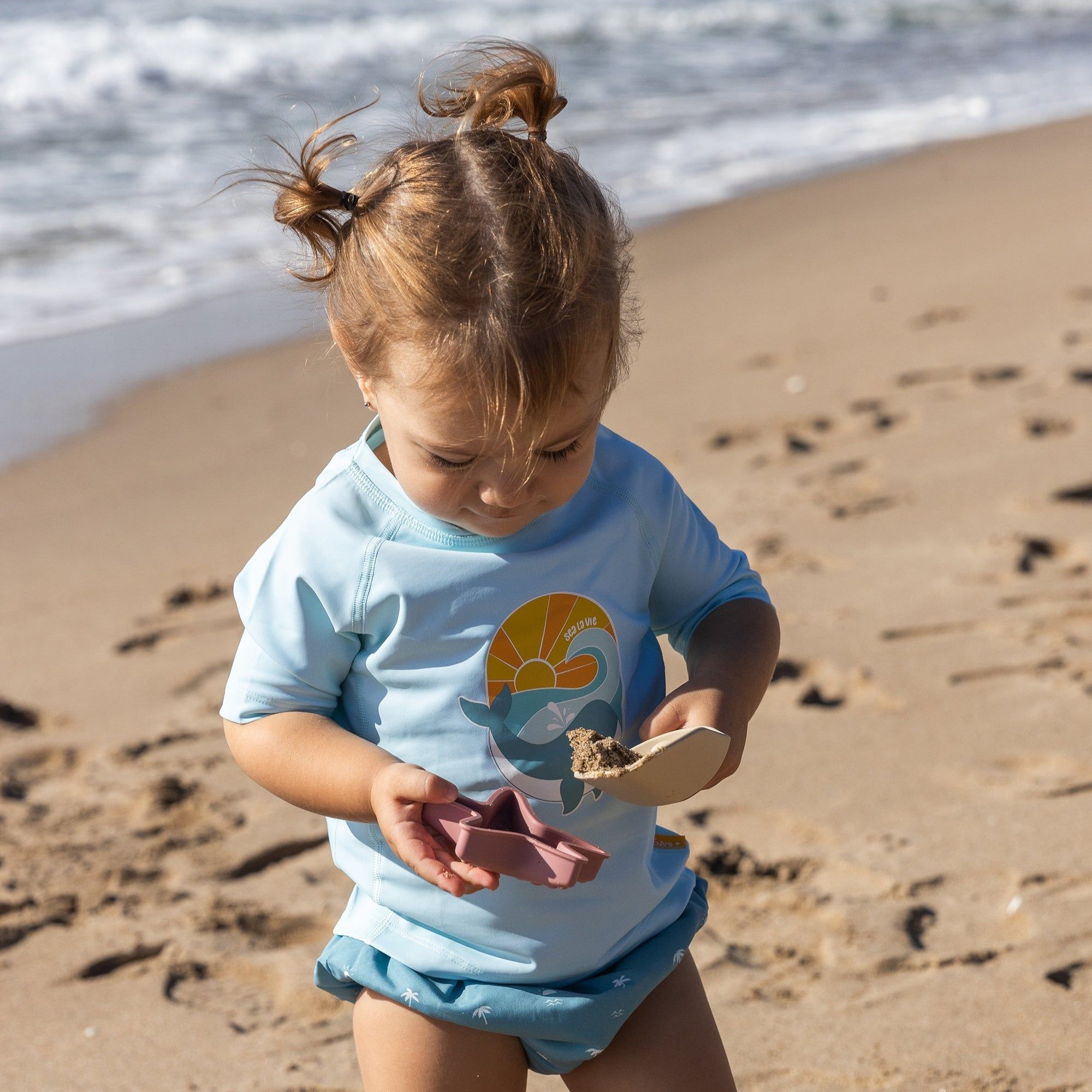 Esta camiseta está confeccionada con un tejido técnico de alta calidad que garantiza un factor de protección ultravioleta (UPF) de +50UV, bloqueando eficazmente el 98% de los rayos UVA y UVB. Su diseño está pensado para la comodidad de los bebés de 3 a 6 meses: es ligera, transpirable y de secado rápido, ideal para llevar en la piscina, la playa o durante cualquier actividad al aire libre. El estampado «Sea La Vie» con motivos marinos y colores suaves, no solo es adorable, sino que invita a soñar con veranos infinitos y momentos felices en familia.